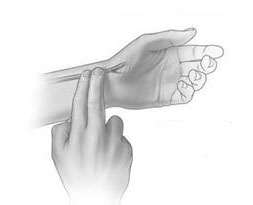 3. Другои рукой обхватите кисть так, чтобы два или три пальца лежали на лучевой артерии у основания большого пальца.